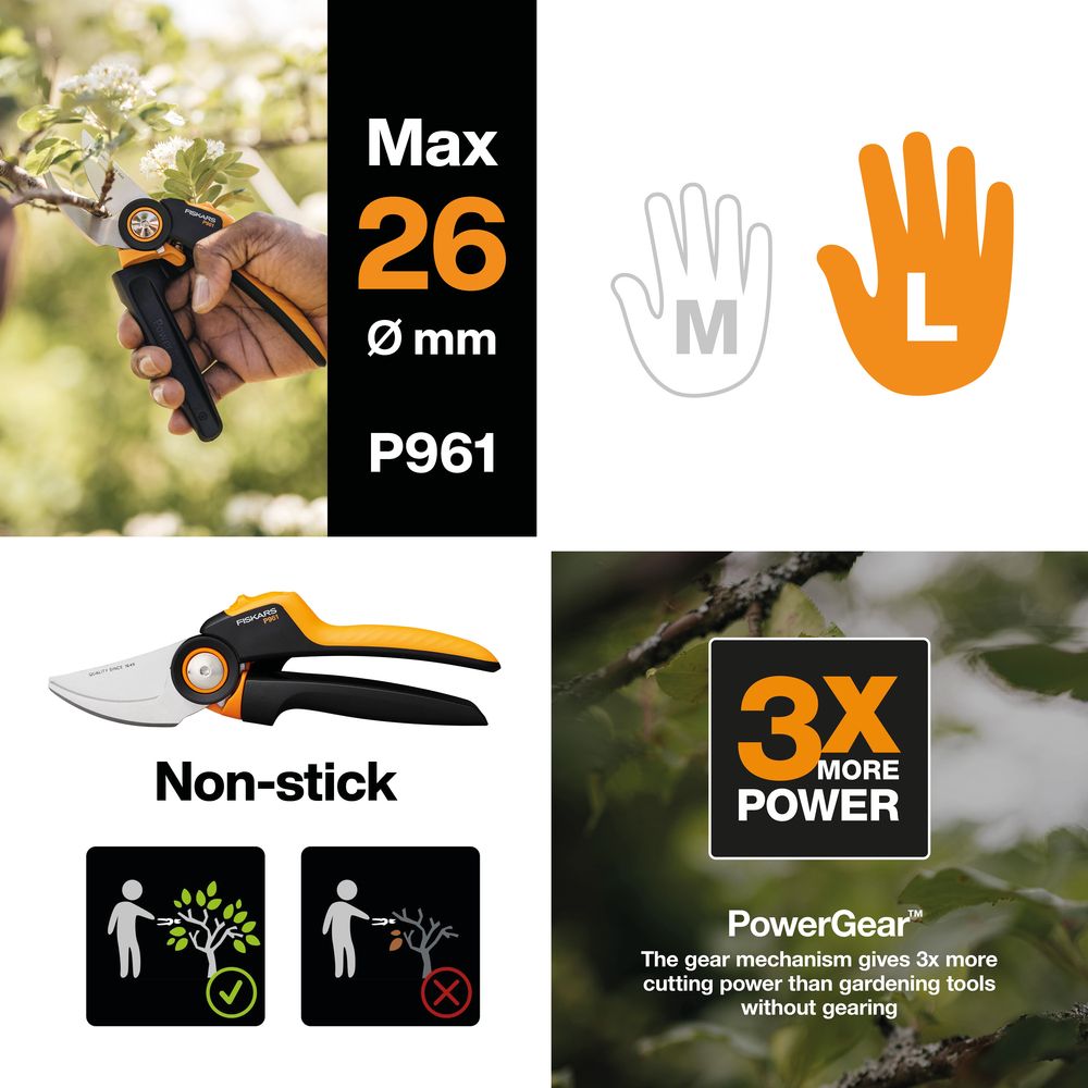 • PowerGear™ максимізує важіль для збільшення потужності різання на 150% порівняно з інструментами Fiskars без шестерень.